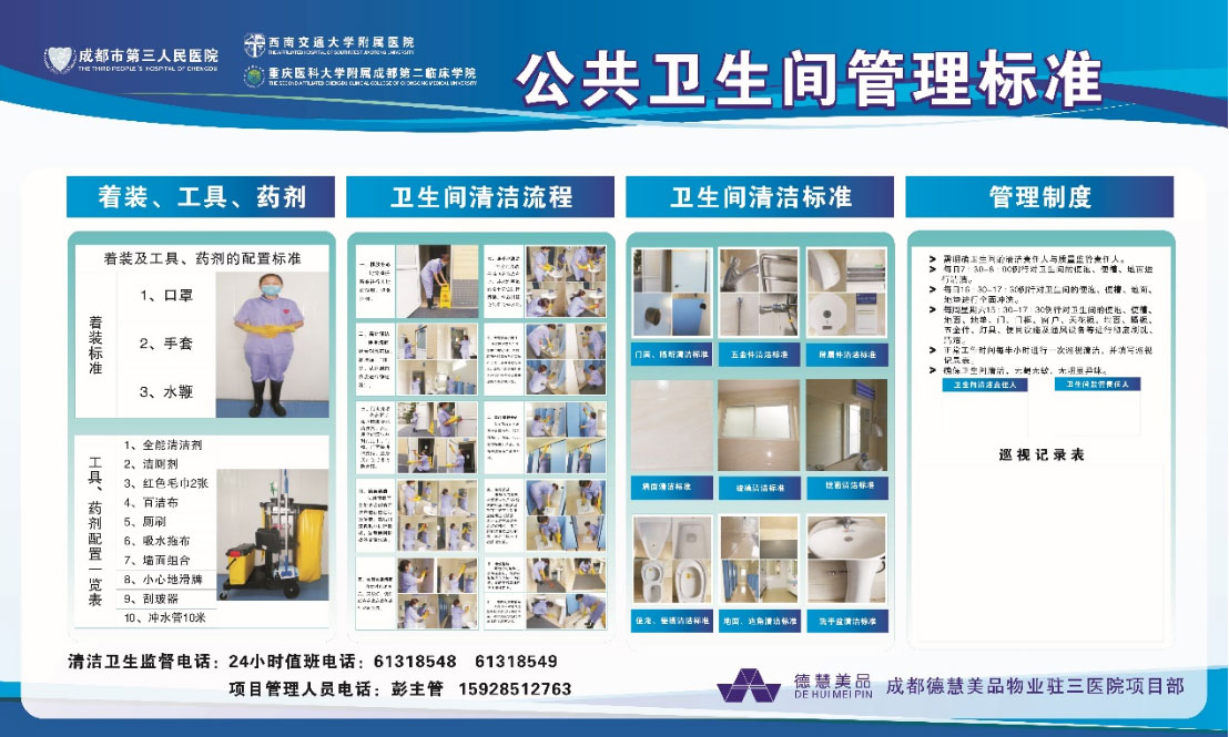 我公司和西安市質(zhì)量技術(shù)監(jiān)督局共同起草西安市《公共廁所管理與服務(wù)規(guī)范》,全國醫(yī)院企業(yè)唯一僅有的標(biāo)準(zhǔn)體系。1、德慧美品的信息化系統(tǒng)是完
